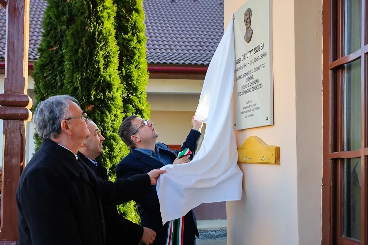A szép számban megjelent érdeklődőket Somogyi László polgármester köszöntötte, elsősorban dr. Seszták Miklós kormánybiztost, Dalmay Árpádot, az emléktábla-állítást kezdeményező nyíregyházi központú, Szentpétery Zsigmond-díjjal kitüntetett Beregszászért Alapítvány kuratóriumának elnökét, Román János Pál szobrászt, Ortutay Zsuzsa rokonait, a nyíregyházi, kisvárdai, nyírmadai vendégeket. Ezt követően Dalmay Árpád röviden beszámolt az alapítvány tevékenységéről. Hangsúlyozta, hogy fő céljuk a trianoni diktátum által elszakított beregszászi magyarság nemzeti önazonosság-tudatának erősítése, s ezt többek között emlékművek, szobrok, emléktáblák állításával érik el. A továbbiakban az alapítvány kuratóriumának elnöke Ortutay Zsuzsára emlékezett, aki 1944. április 22-én született Beregszászon. Az Ungvári Képzőművészeti Szakközépiskolában szerzett végzettséget kerámia szakon. Hazakerülve szülővárosába, előbb a téglagyár minőségellenőre és dekoratőre, majd a majolikagyár tervezőművésze volt. Pedagógusként is tevékenykedett a Beregszászi Művészeti Iskolában, a Bethlen Gábor Magyar Gimnáziumban, a Beregszászi Kossuth Lajos Középiskolában és a II. Rákóczi Ferenc Kárpátaljai Magyar Főiskolán. Magyarországon a fehérgyarmati művelődési házban kerámia szakkört vezetett. Művészi munkássága 1964-ben kezdődött. 1970-től minden megyei és járási kiállításon szerepelt műveivel. Szülővárosán kívül egyéni és csoportos kiállításai voltak Ungváron, Kassán, Fehérgyarmaton, Hatvanban, Budapesten, Vásárosnaményban, Siklóson, Gödöllőn, Érden, Vasváron, Nyírkarászon. Kereken két tucat emléktábla domborművét készítette el, ezek zöme Beregszászon látható, de kettő Hatvanban is.