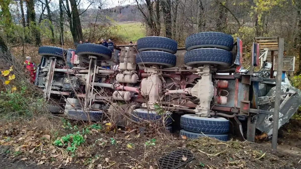 A Renault márkájú betonkeverő teherautó sofőrje elvesztette uralmát járműve felett, majd az árokba hajtott. A deformálódott fülke miatt a férfi önállóan nem tudott kiszabadulni.
