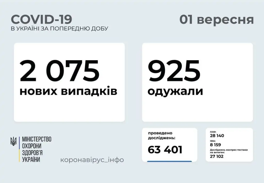 A Közegészségügyi Központ szeptember 1-i adatai szerint Ukrajnában 2 288 371 koronavírus-fertőzöttet regisztráltak eddig.