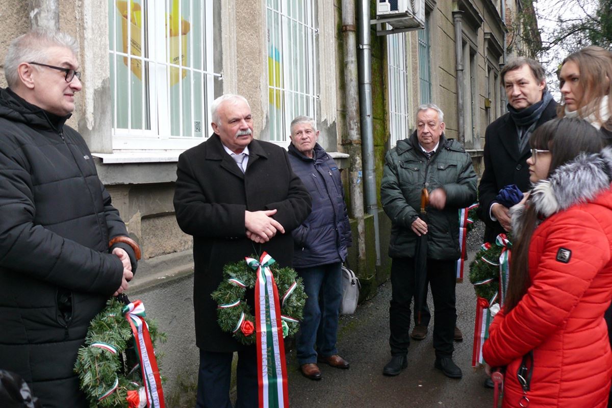 A Kárpátaljai Magyar Művelődési Intézet (KMMI) és a Magyar Értelmiségiek Kárpátaljai Közössége (MÉKK) csendes koszorúzásra invitálta az érdeklődőket az emléktáblához, ahol Zubánics László, a KMMI és az UMDSZ elnöke köszöntötte a megjelenteket, köztük kiemelt tisztelettel dr. Papp Ferencet, Magyarország Ungvári Főkonzulátusának konzulját és dr. Gyebnár Istvánt, a Beregszászi Konzulátus ügyvezetőjét, illetve Babják Zoltánt, a Beregszászi kistérség polgármesterét.