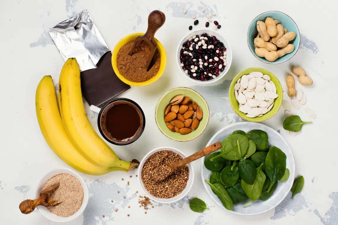 A magnézium természetes forrásai: zöld leveles zöldségek (spenót, mángold, kelkáposzta, a fehérrépa és a cékla zöldje), zöldfűszerek, tökmag, kendermag, lenmag, szezámmag, chia mag, napraforgómag, babfélék, csicseriborsó, lencse, barna rizs, quinoa, hajdina, amaránt, zab, köles, mandula, brazil dió, kesudió, földimogyoróvaj, magas kakaótartalmú étcsokoládék, articsóka, zöldborsó, édesburgonya, avokádó, banán, málna, szeder, kivi, tofu, kókusztej, tonhal, makréla, stb.