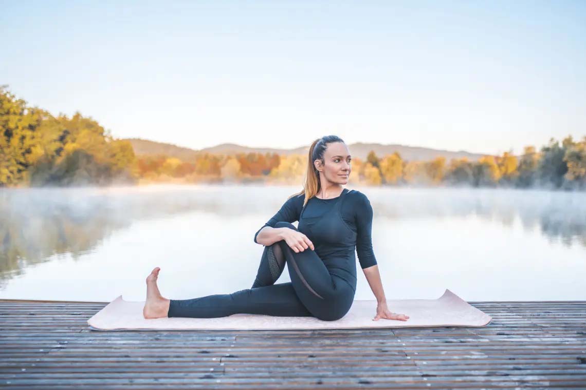 Ezt követően a bal térdedet húzd a jobb lábad felé, és a mozdítsd úgy, hogy a külső oldalával a padlóhoz érj. Ezután a bal kezedet tedd a jobb térdedhez, és csavard meg óvatosan a csípődet, majd tartsd ki 5 levegővételig.
